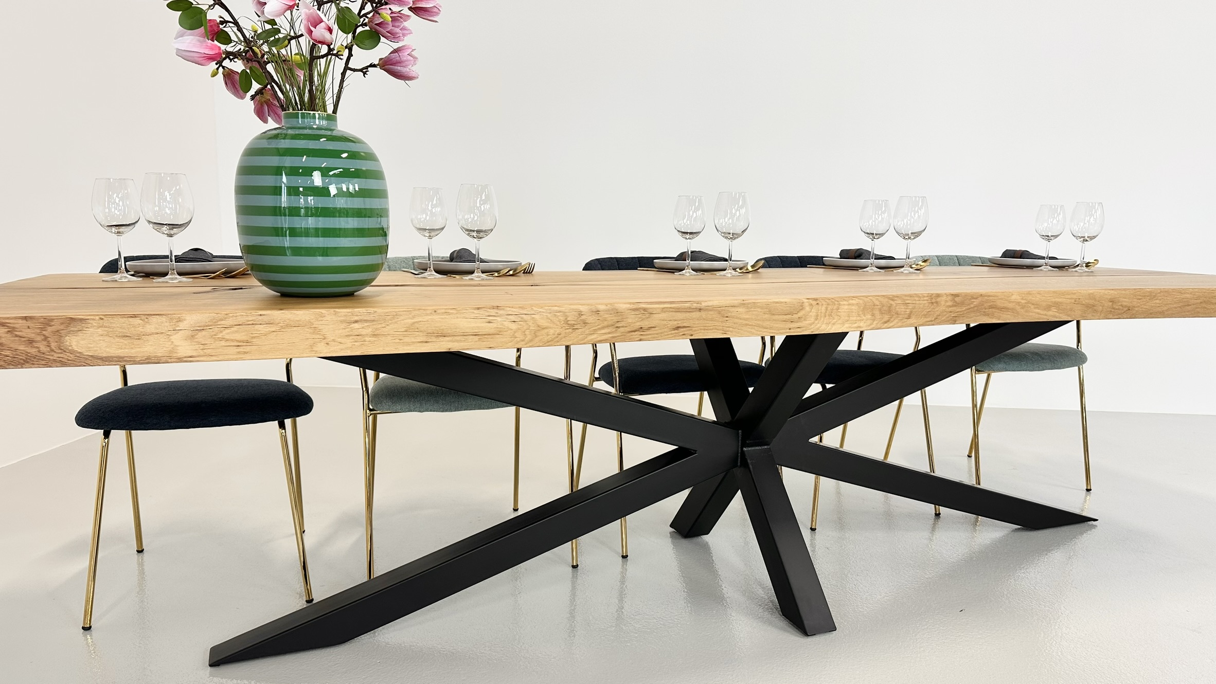 Dette gigantiske bord er skabt af én enkelt ovntørret egetræsplanke og udstråler en sjælden elegance, der fanger enhver opmærksomhed.