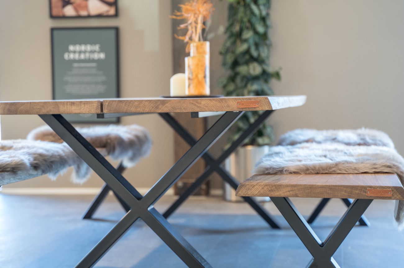 Det massive bord er lavet af to store planker af eg, som har en tykkelse på 4,5 cm. Eg er kendt for sin robusthed, samt holdbarhed og giver bordet en naturlig og varm glød. Plankebordet har en elegant og rustik overflade med åretegninger og knaster, der giver det et autentisk og naturligt udseende.