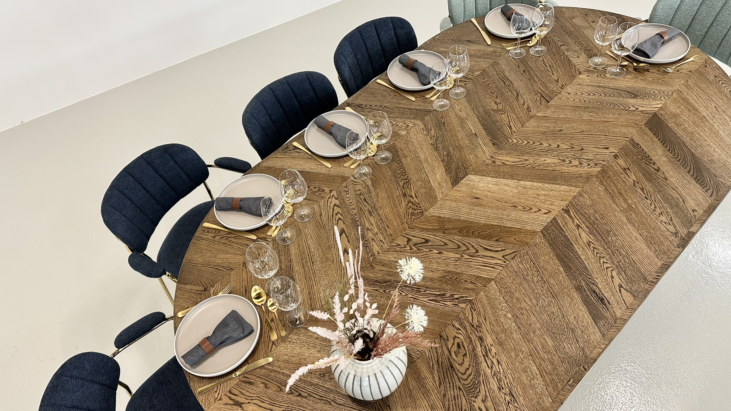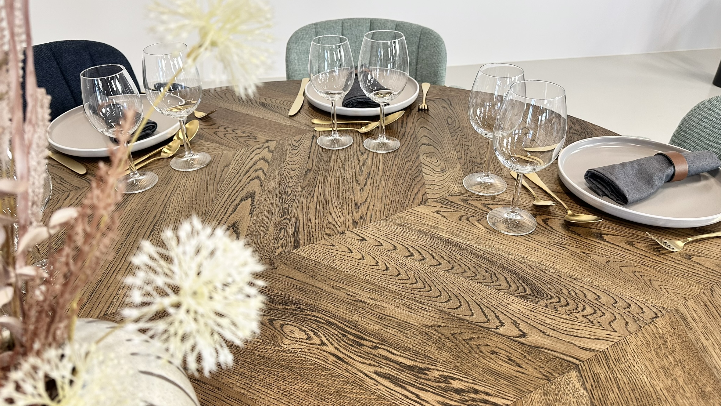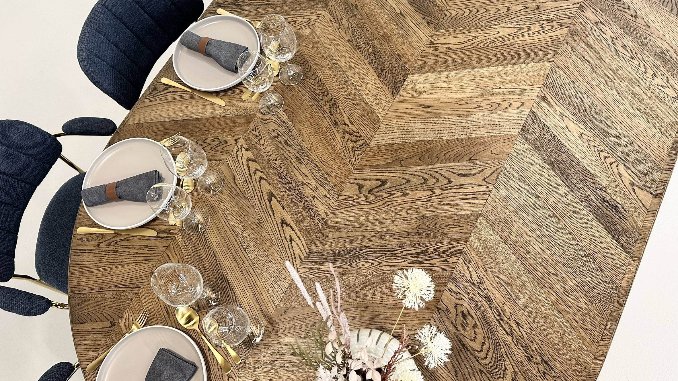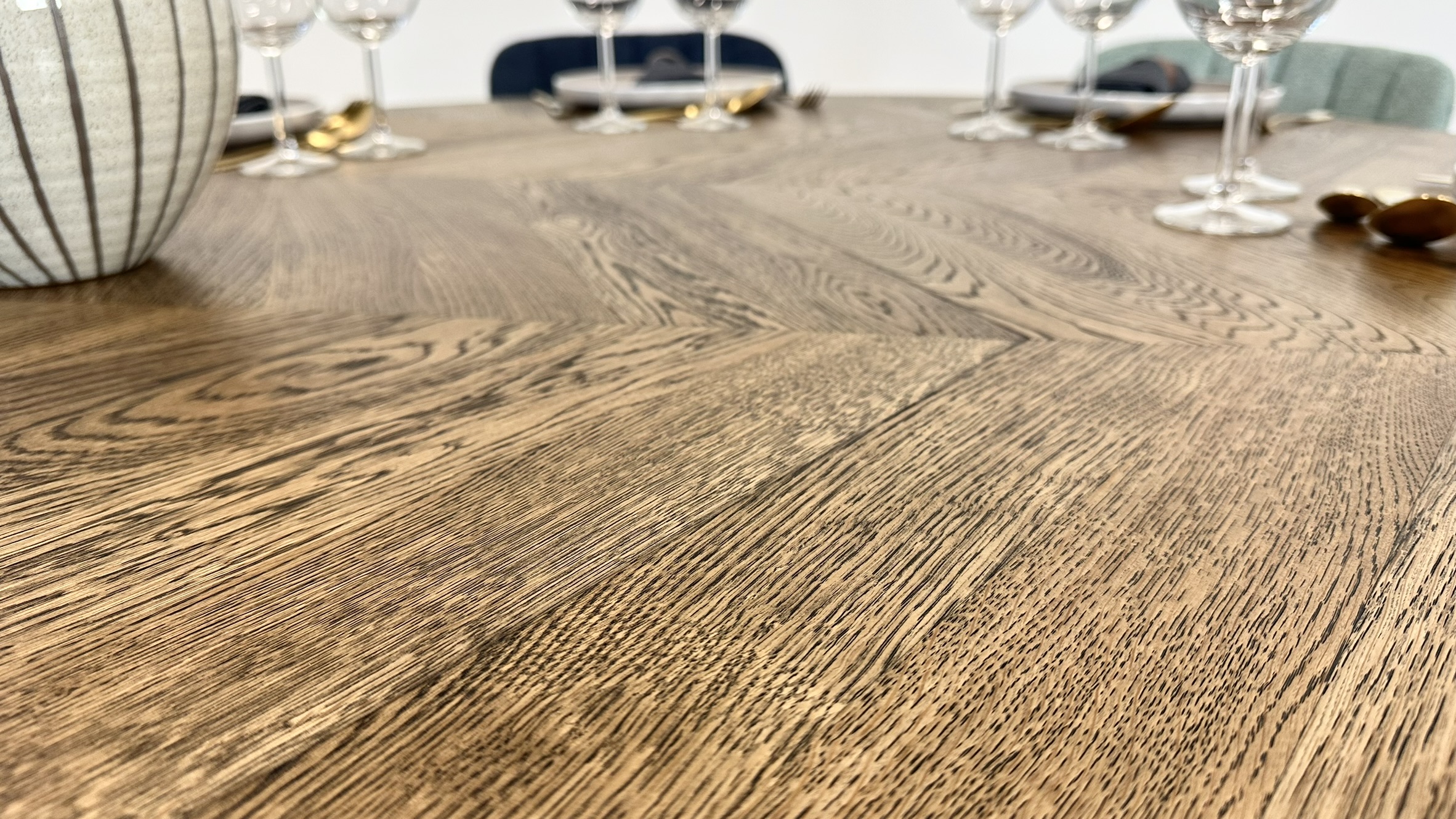 Bordet er fremstillet af 15 mm massive egetræsstave monteret på MDF plade, kendt for sin holdbarhed og naturlige skønhed. Overfladen prydes af et klassisk FRANSK sildebensmønster, hvor hver træstav er omhyggeligt udvalgt og placeret for at skabe en harmonisk og dynamisk struktur. Dette mønster tilføjer dybde og karakter til bordet, hvilket gør det til et centralt element i enhver spisestue.