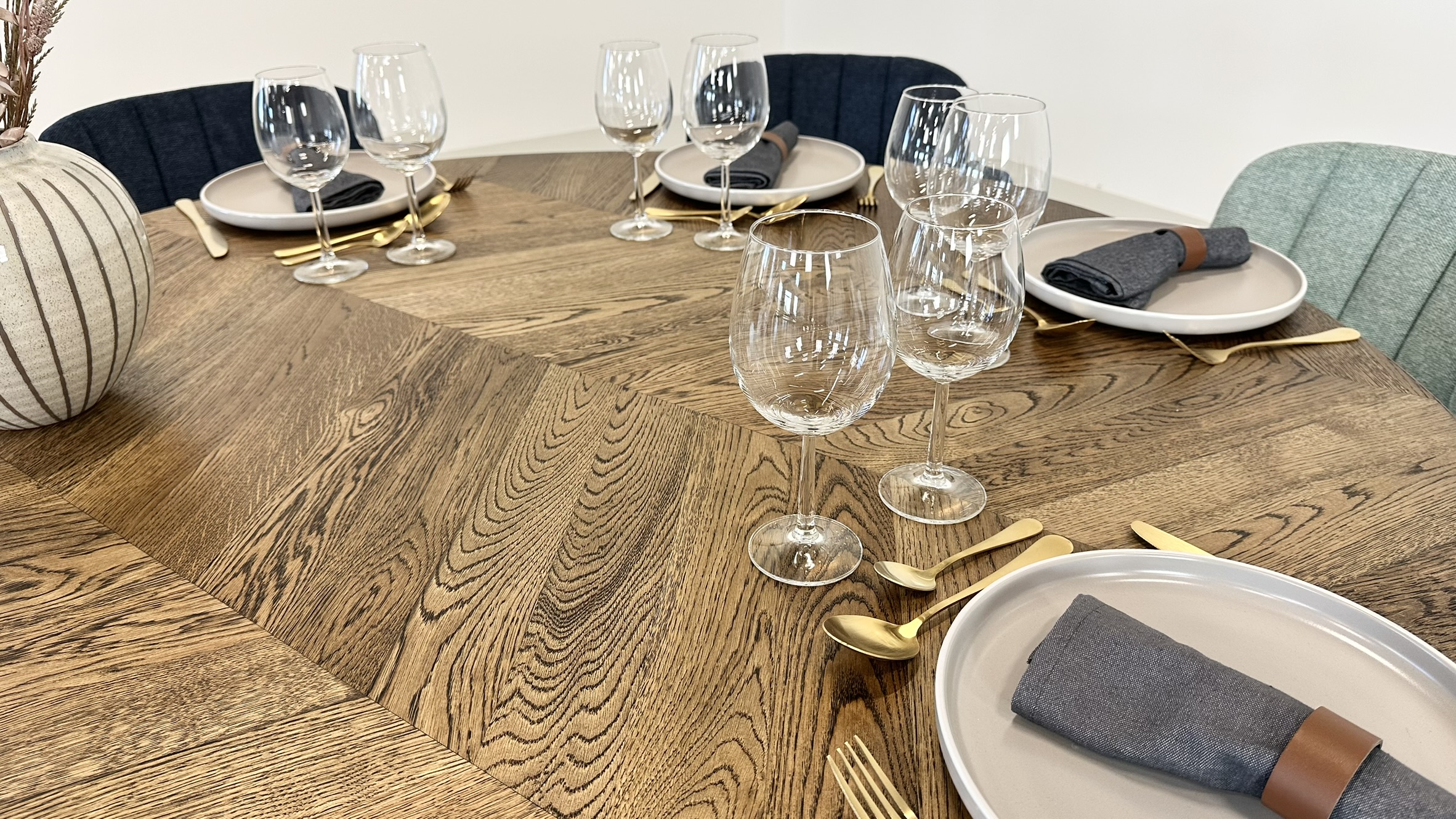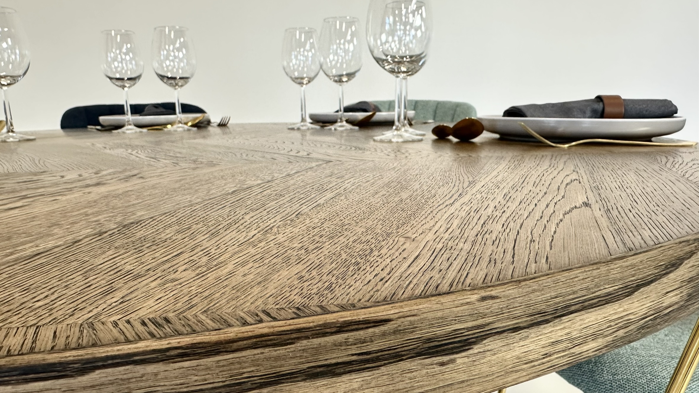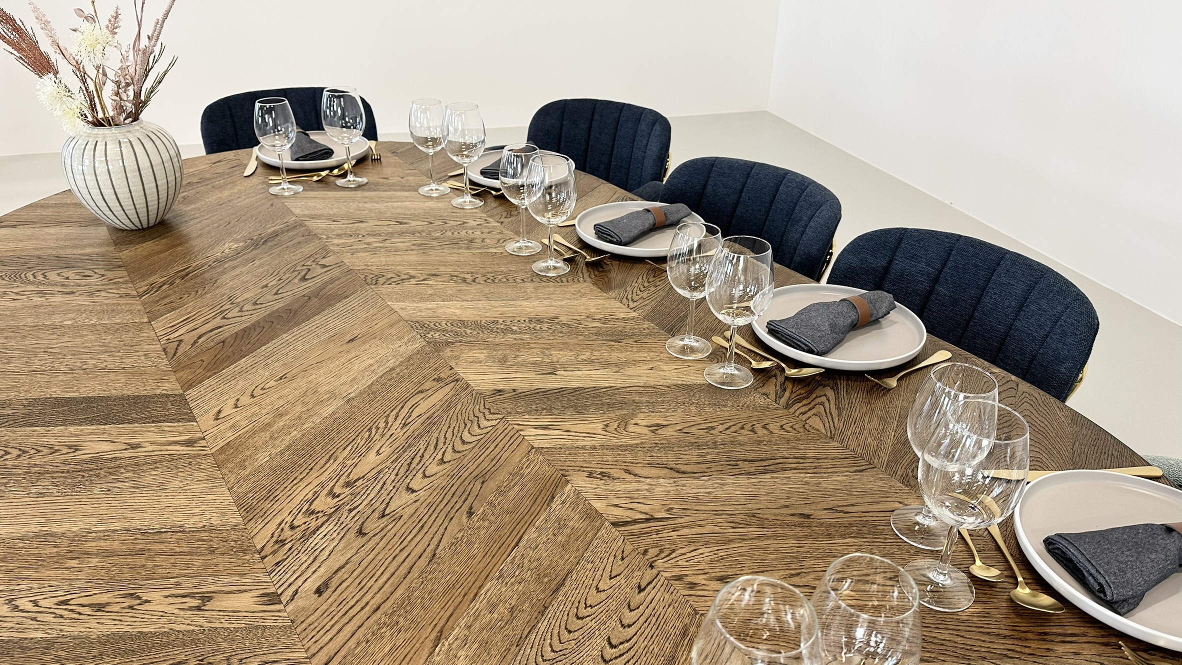 Bordet er fremstillet af 15 mm massive egetræsstave monteret på MDF plade, kendt for sin holdbarhed og naturlige skønhed. Overfladen prydes af et klassisk FRANSK sildebensmønster, hvor hver træstav er omhyggeligt udvalgt og placeret for at skabe en harmonisk og dynamisk struktur. Dette mønster tilføjer dybde og karakter til bordet, hvilket gør det til et centralt element i enhver spisestue.