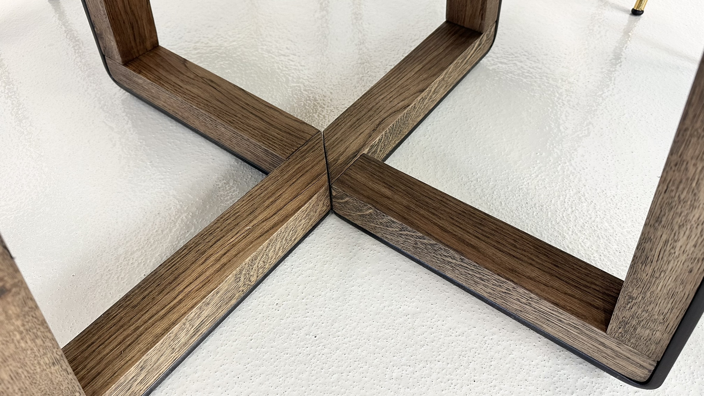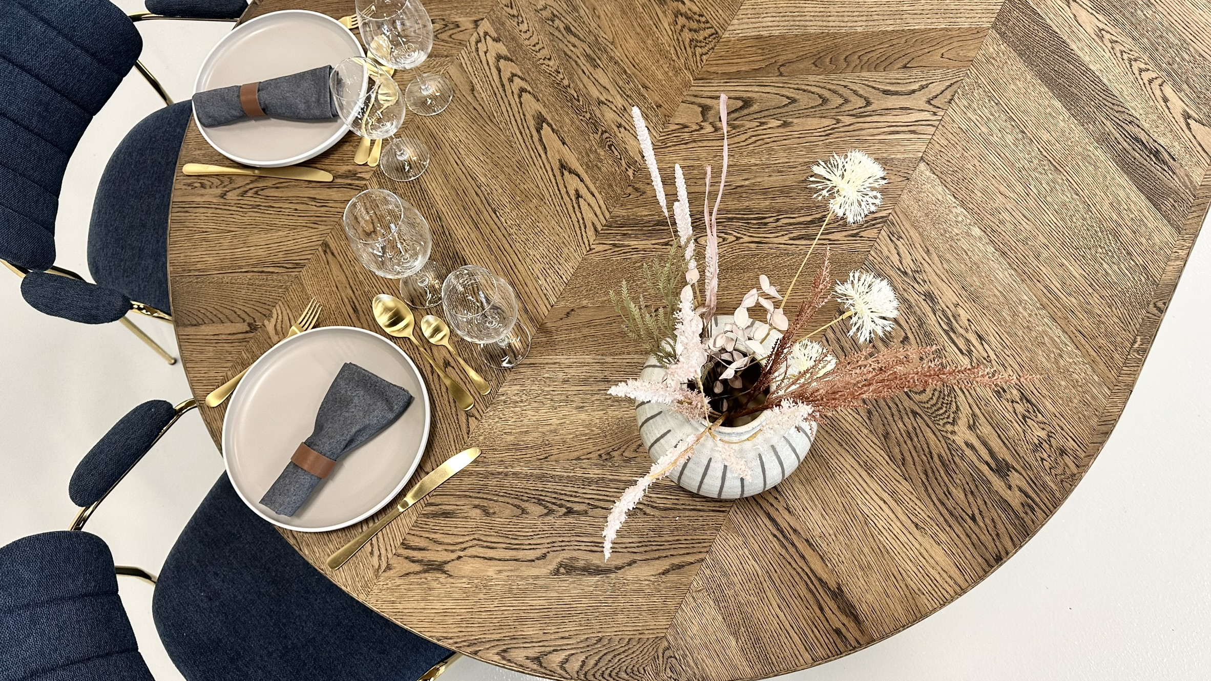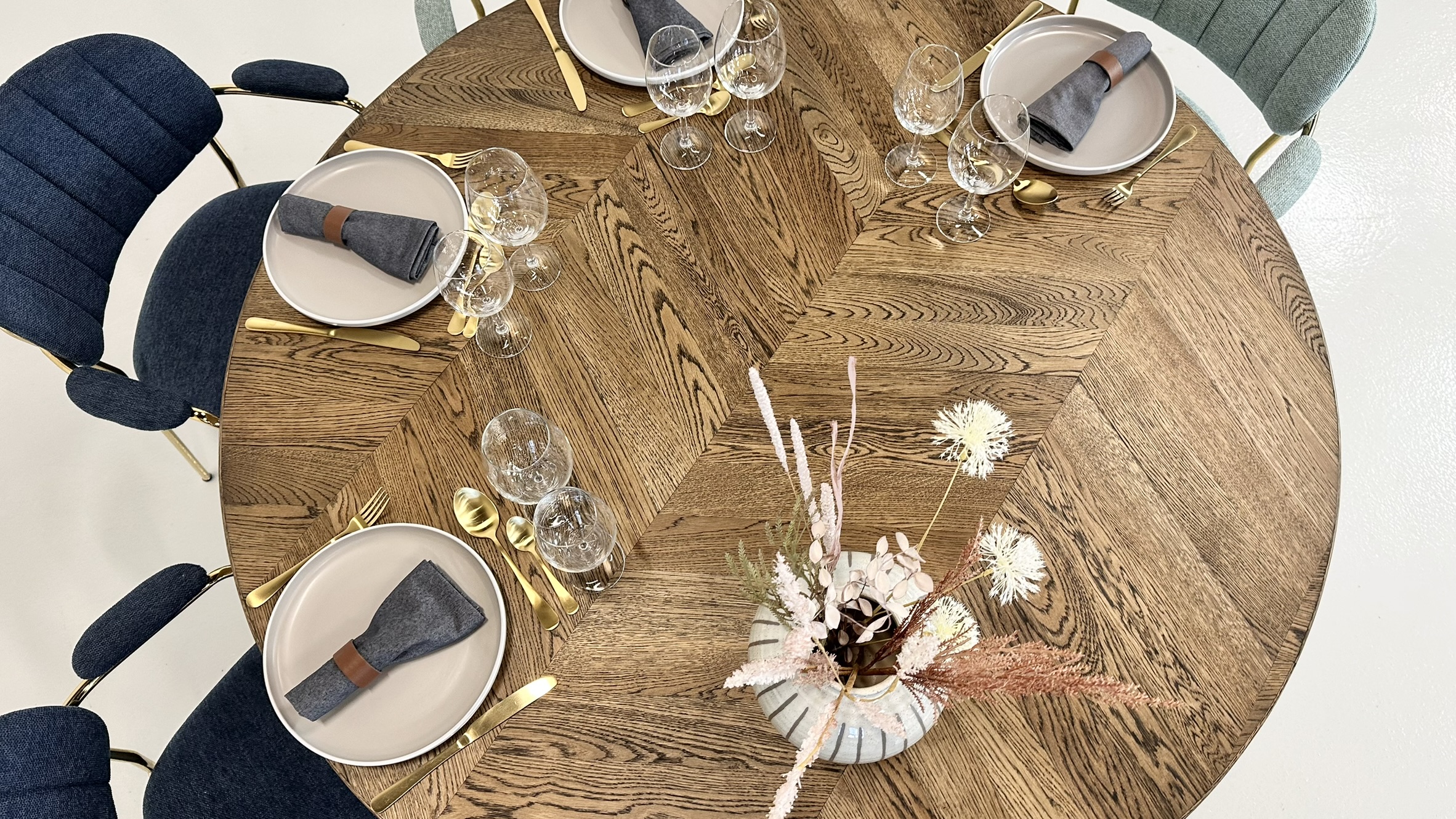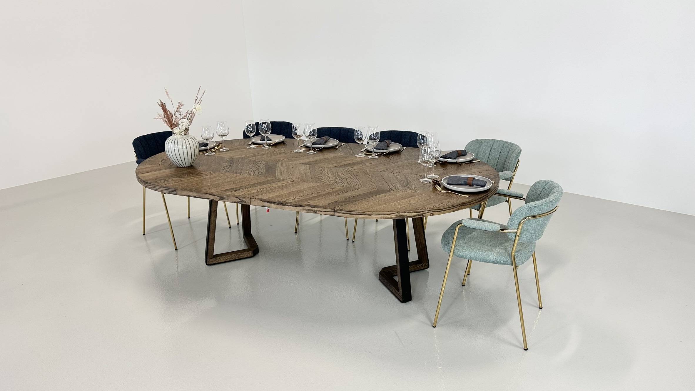 Bordet er fremstillet af 15 mm massive egetræsstave monteret på MDF plade, kendt for sin holdbarhed og naturlige skønhed. Overfladen prydes af et klassisk FRANSK sildebensmønster, hvor hver træstav er omhyggeligt udvalgt og placeret for at skabe en harmonisk og dynamisk struktur. Dette mønster tilføjer dybde og karakter til bordet, hvilket gør det til et centralt element i enhver spisestue.