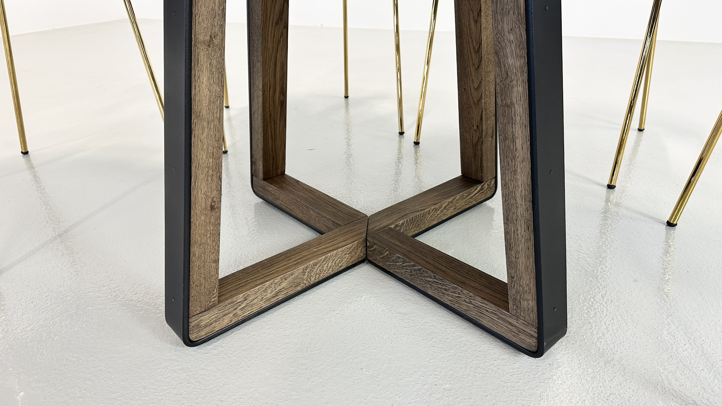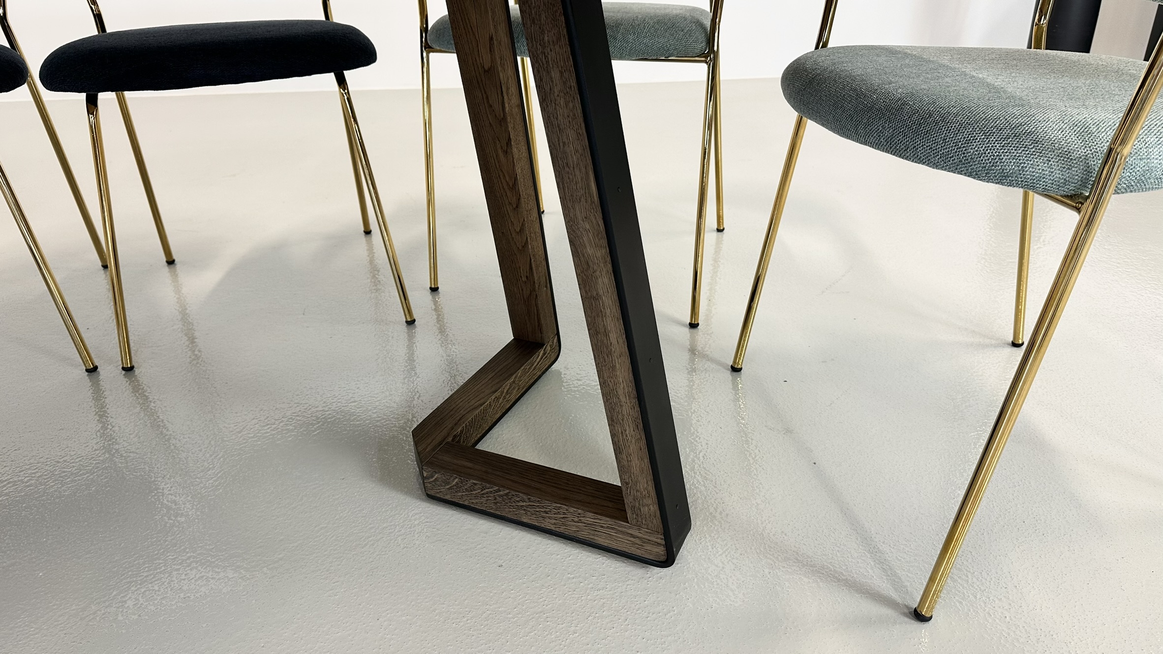 Den runde form med en diameter på 140 cm skaber en intim og indbydende atmosfære, der fremmer samtale og samvær. Bordet står på en Træ / Metal dobbelt Trapez-fod, også udført i egetræ og behandlet med sortbrun ophærdet olie, hvilket sikrer en ensartet og elegant sammenhæng.