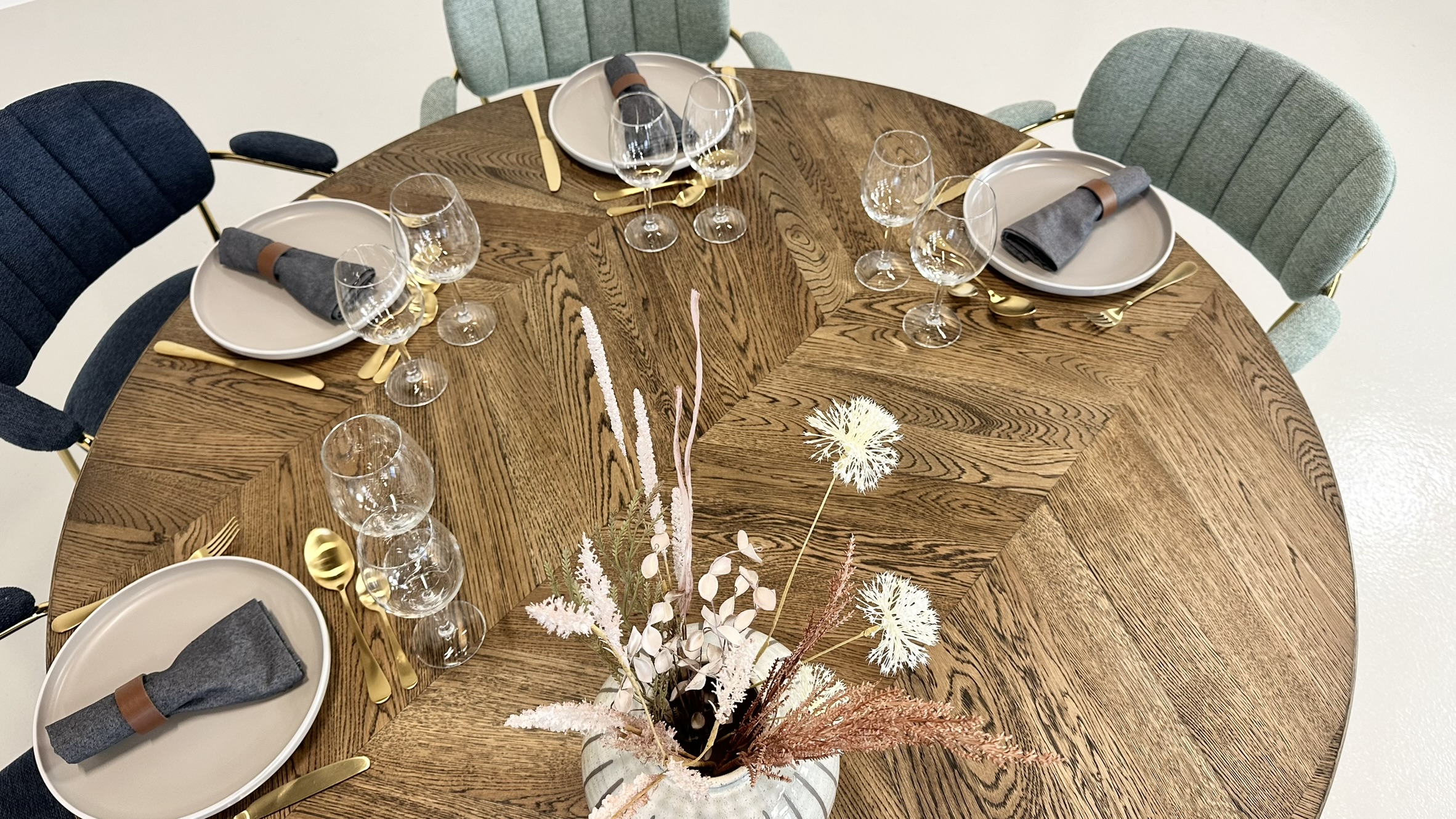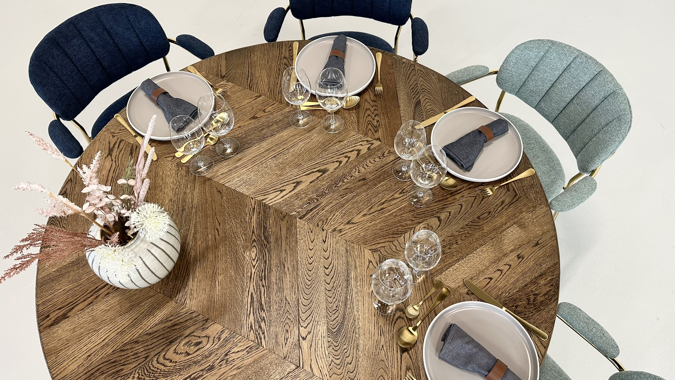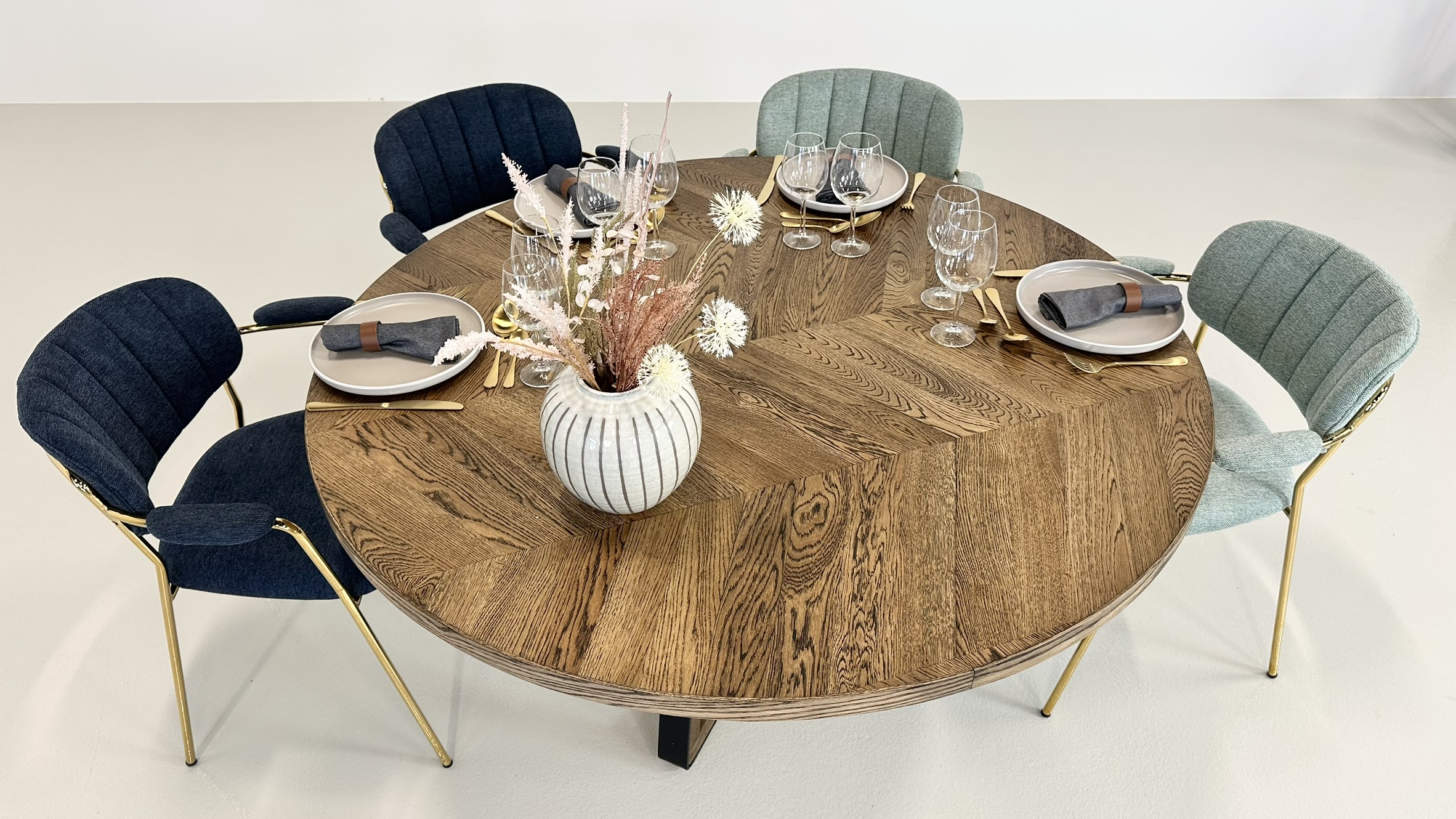 Rundt sildebensbord med udtræk til 2 stk tillægsplader – Fransk mønster – Ø140 cm
