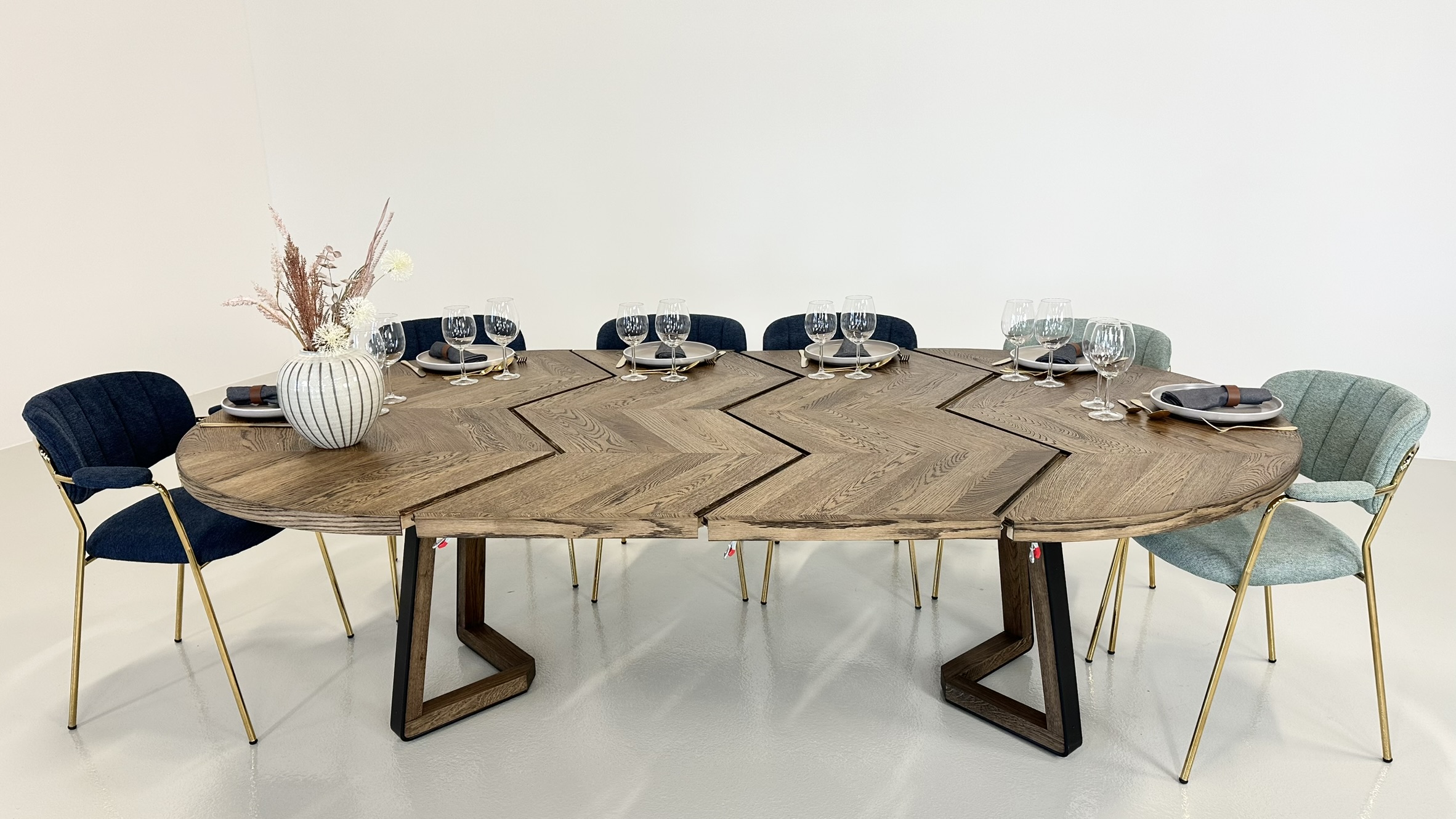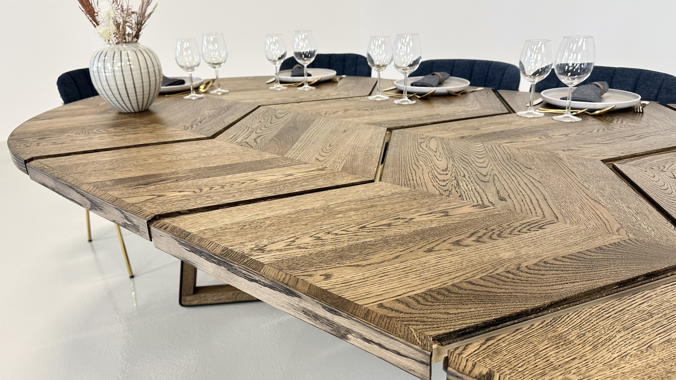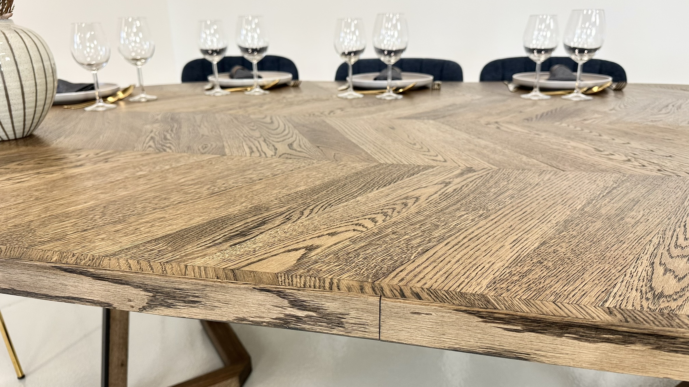 En af de mest bemærkelsesværdige funktioner ved dette bord er det skjulte udtrækssystem, der gør det muligt at udvide bordets kapacitet hurtigt og nemt. Med to medfølgende tillægsplader kan bordet forlænges med 100 cm(begge plader skal bruges), hvilket giver ekstra plads til gæster eller større sammenkomster. Tillægspladerne er designet til at matche bordets sildebensmønster, hvilket sikrer en sammenhængende og æstetisk helhed, selv når bordet er udvidet.