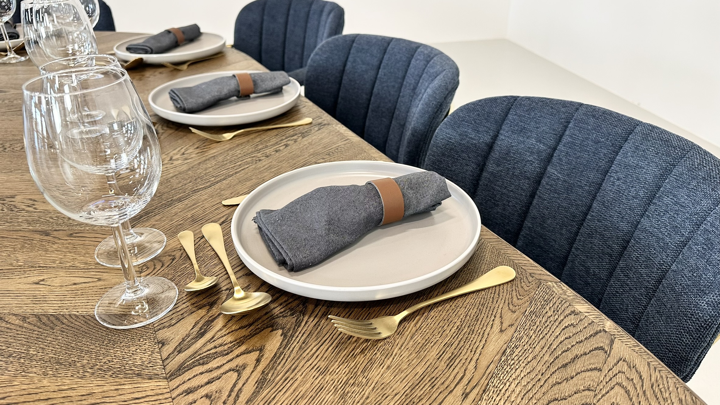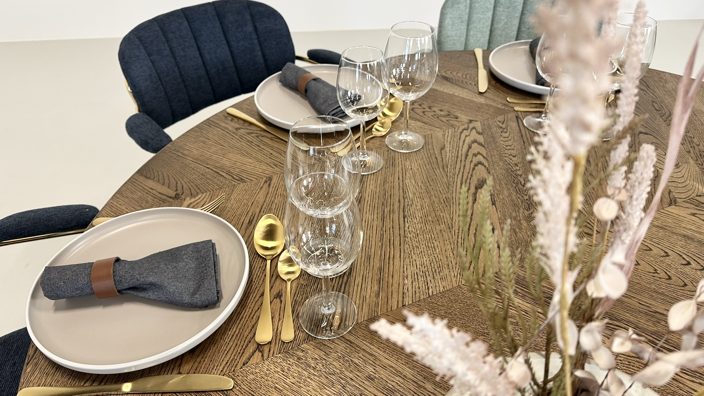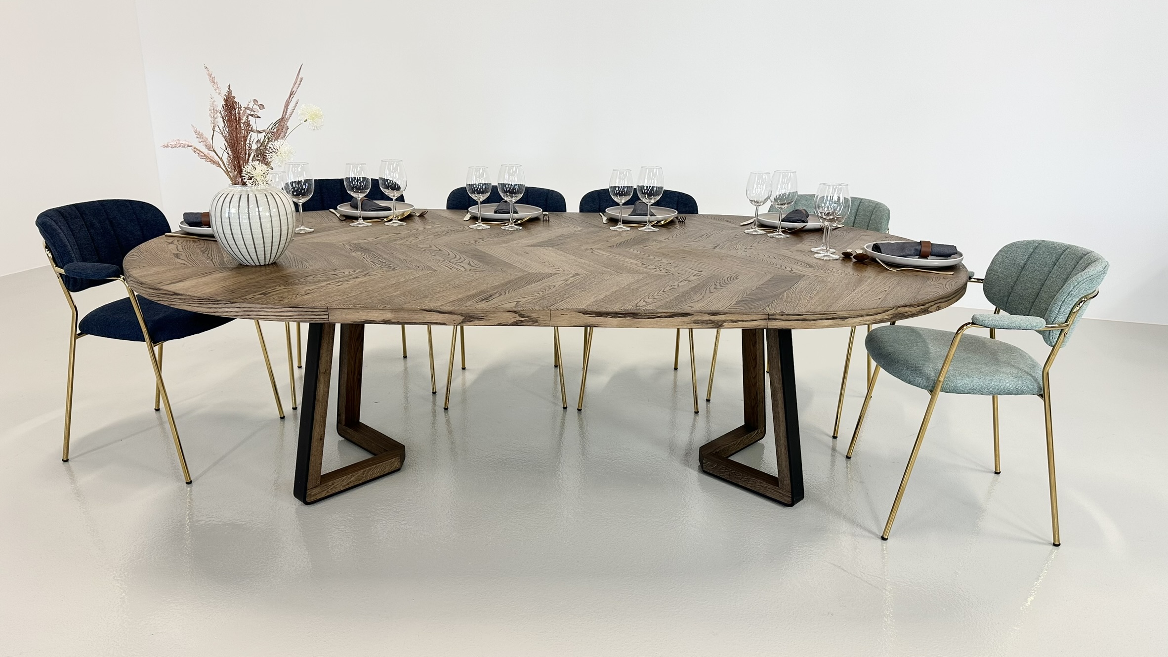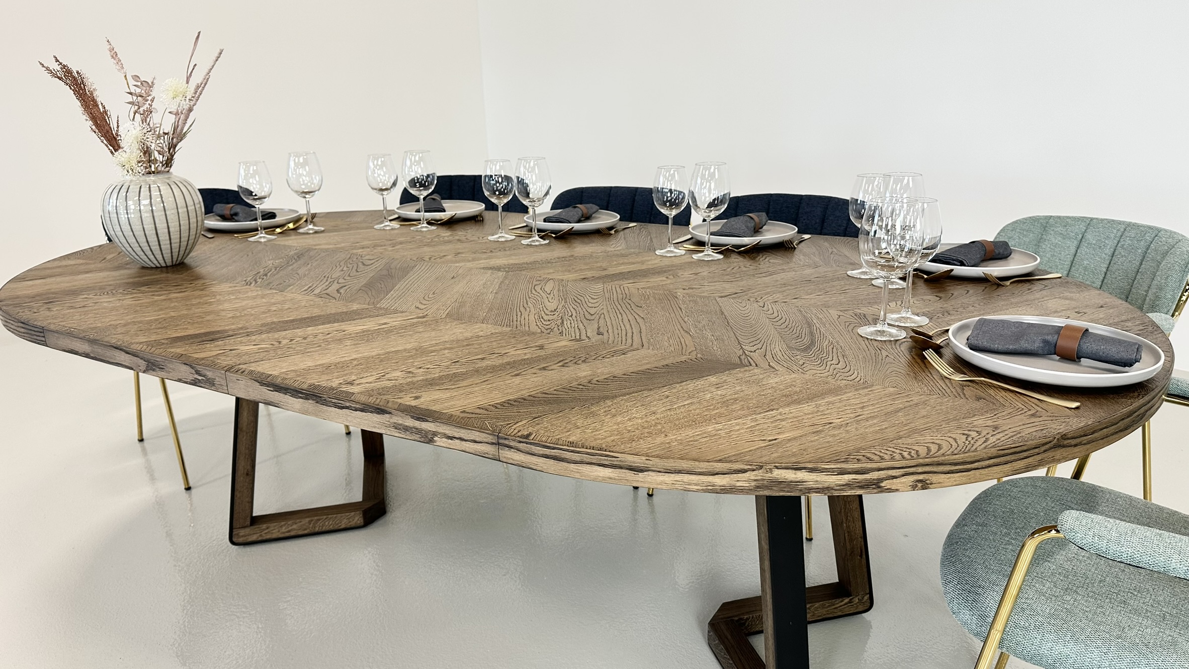 En af de mest bemærkelsesværdige funktioner ved dette bord er det skjulte udtrækssystem, der gør det muligt at udvide bordets kapacitet hurtigt og nemt. Med to medfølgende tillægsplader kan bordet forlænges med 100 cm(begge plader skal bruges), hvilket giver ekstra plads til gæster eller større sammenkomster. Tillægspladerne er designet til at matche bordets sildebensmønster, hvilket sikrer en sammenhængende og æstetisk helhed, selv når bordet er udvidet.