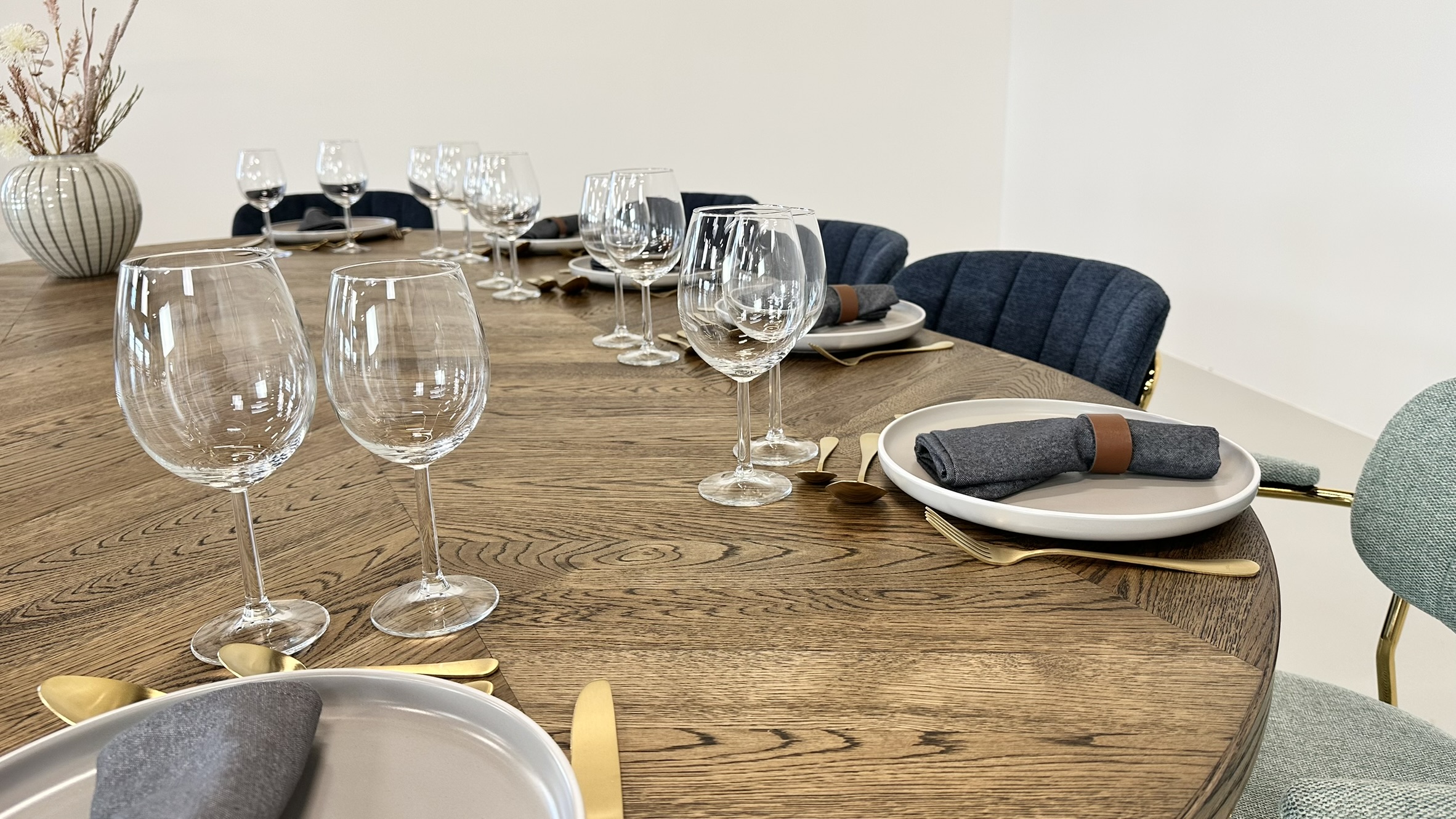 Udtrækssystemet er diskret integreret i bordets konstruktion, så det ikke forstyrrer det rene og elegante design. Når tillægspladerne ikke er i brug, opbevares de nemt og bekvemt, hvilket gør det muligt at tilpasse bordets størrelse efter behov uden besvær.